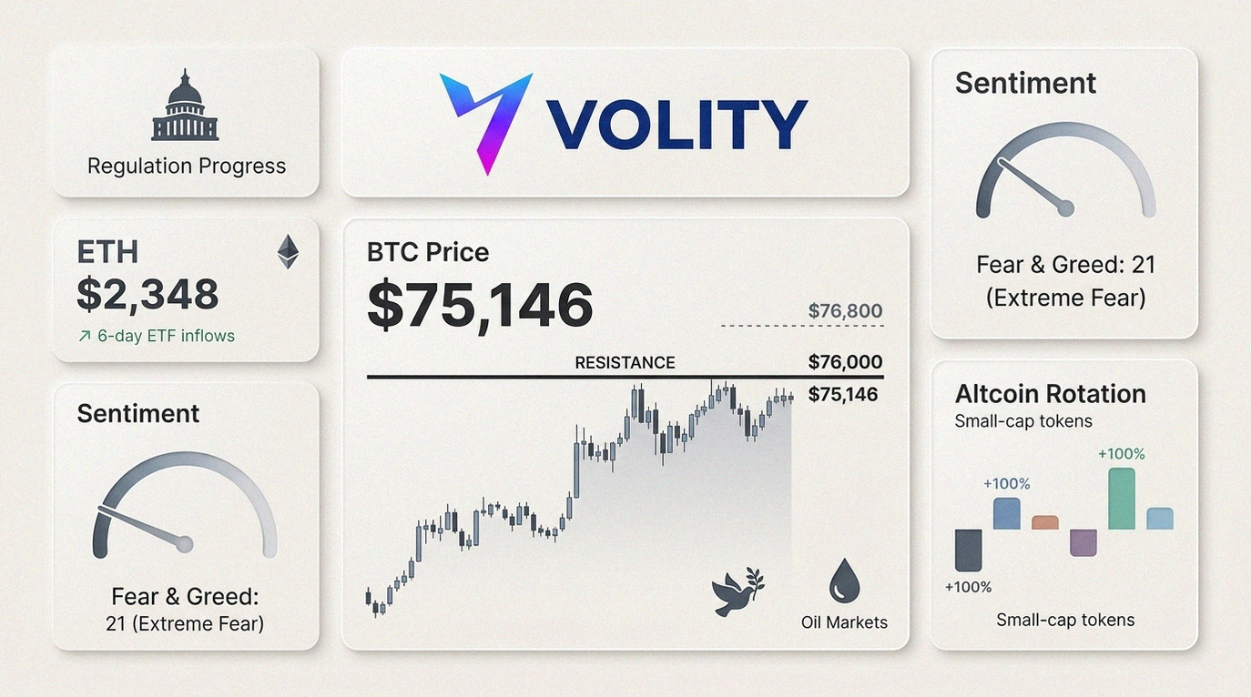 - BTC: $75,146, up 0.45%, resistance near $76,000