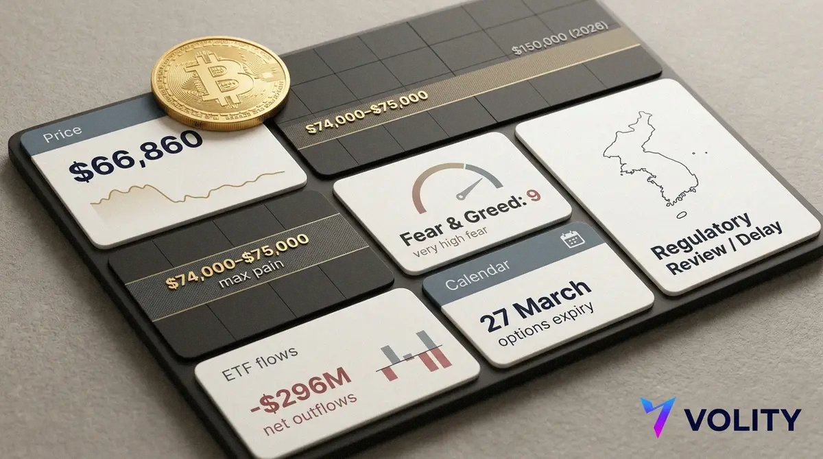 Bitcoin spent Monday trying to look casual after a weekend slide that rattled even hardened holders. It changed hands near $66,860, up about 0.4% from Sunday’s low, while traders picked through the wreckage of a monster options expiry and a sudden wobble in spot ETF demand.