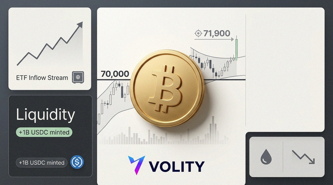 BTC dipped close to $68,000 before snapping higher into the New York open, then ground up through the $70,000 handle. Technicians flagged a tightening range that resembles an ascending triangle, so a decisive hold above $70,000 matters more than the intraday spike. Meanwhile, market makers described better two way interest, with buyers returning once oil backed off and volatility sellers reappeared in the options complex.