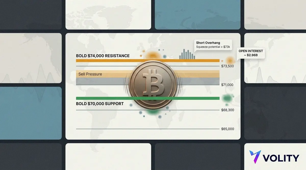 Derivatives explain the day-to-day tug of war. Open interest sits around $2.96 billion on major venues, with heavy positioning between $69,000 and $71,000. In addition, an estimated $180 million to $220 million of shorts sit around current levels. That matters because a push through $73,000 could force buy-to-cover orders, then trigger liquidations, then feed momentum. Traders have seen that film before, and it rarely ends quietly.