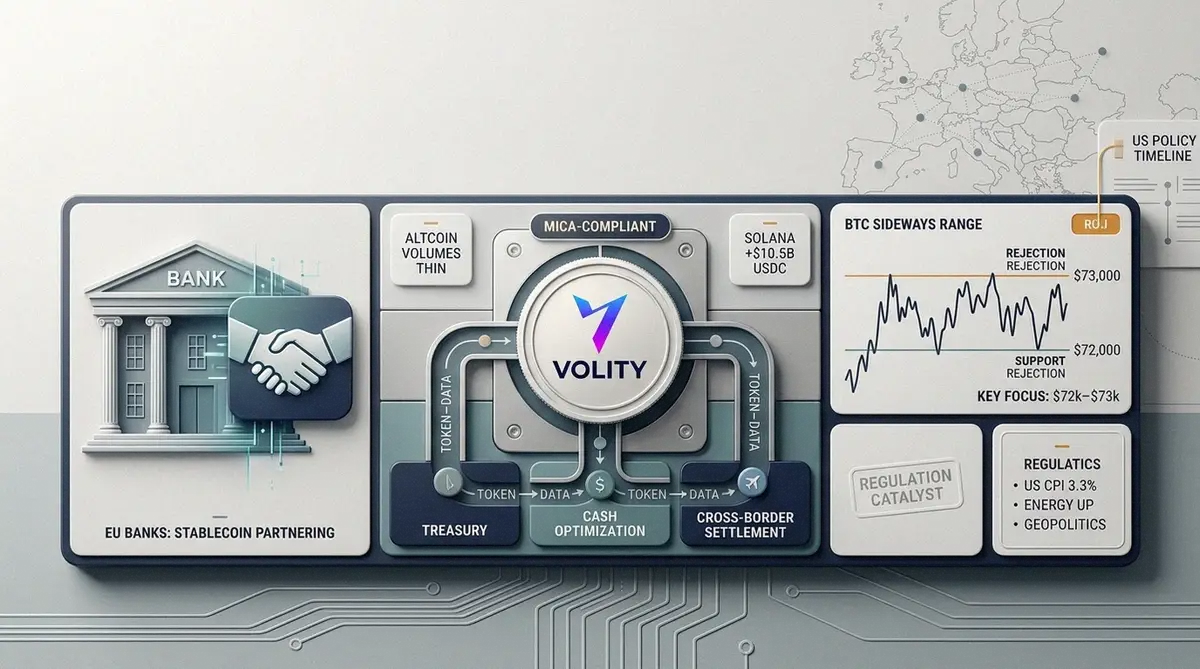European banks are picking stablecoin partners at speed as MiCA moves from theory to paperwork. Meanwhile, Bitcoin held a tight $72,000-$73,000 range as traders weighed softer inflation against louder geopolitics. However, the bigger story sits in regulation, as Washington’s market structure fight drags on and Europe’s rulebook bites.