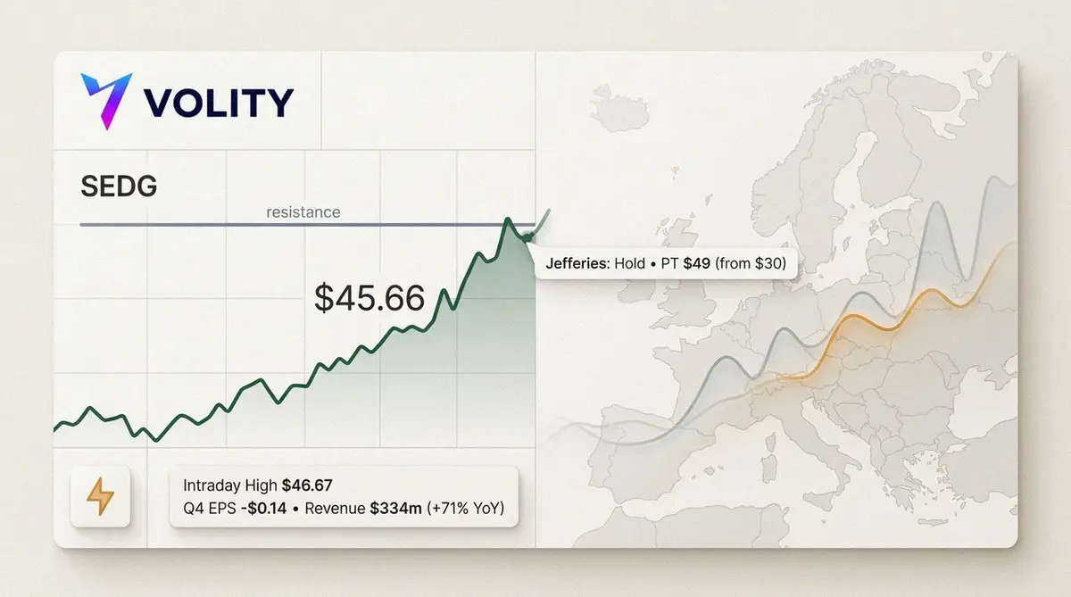 By Thursday’s close, SEDG sat at $45.66, up 1.74%, after tagging an intraday high of $46.67. However, the real headline was the shift in tone. Jefferies argued that European energy price volatility could revive solar installations, which would matter for an inverter supplier that lives and dies by project timing and distributor restocking.